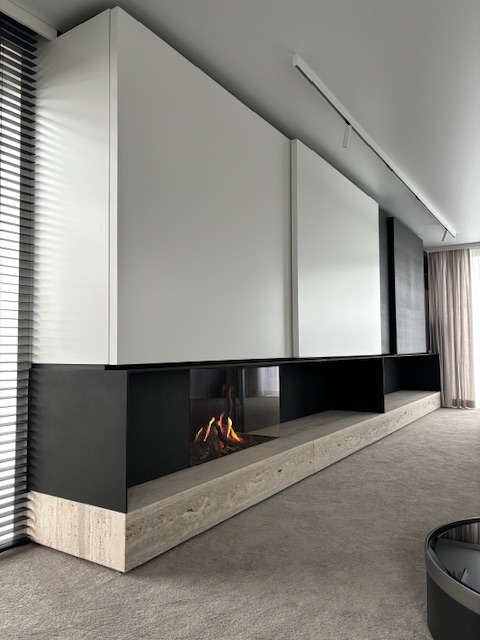 Ontspanningsruimte met multifunctionele haardwand en pooltafel